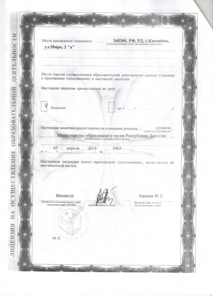 | Адрес местонахождения образовательной организации* | 368300 Республика Дагестан, г. Каспийск ул. Мира 2 |
